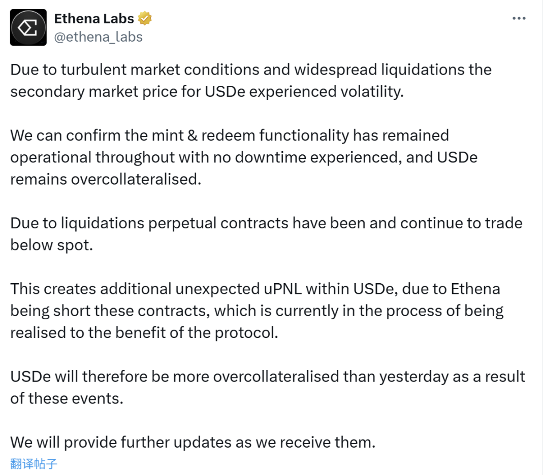 Ethena 刚刚发布官方回应称,USDe 的铸造与赎回功能在整个过程中始终保持运行,未出现任何停机情况,且 USDe 仍保持超额抵押状态。由于清算的发生,永续合约的价格一直低于且继续低于现货价格。由于 Ethena 持有这些合约的空头头寸,这给 USDe 带来了额外的意外未实现盈亏(uPNL),而目前这部分盈亏正在逐步实现,并将为协议带来益处。因此,受这些事件影响,USDe 的超额抵押程度将比昨日更高。