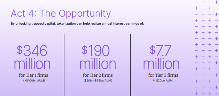 此外,纳斯达克还宣布了与 Talos 达成合作,将 Talos 的数字资产基础设施与纳斯达克的 Calypso 及交易监察平台相连接,共同开发代币化抵押品管理综合解决方案。纳斯达克报告显示,全球有约 368 亿美元的抵押品因结算滞后和跨时区障碍被困在账户里无法调动,它们可以利用代币化实现每年 3.46 亿美元的利息收入增长,而规模较小的公司则可以获得 700 万美元至 1.9 亿美元的收益。