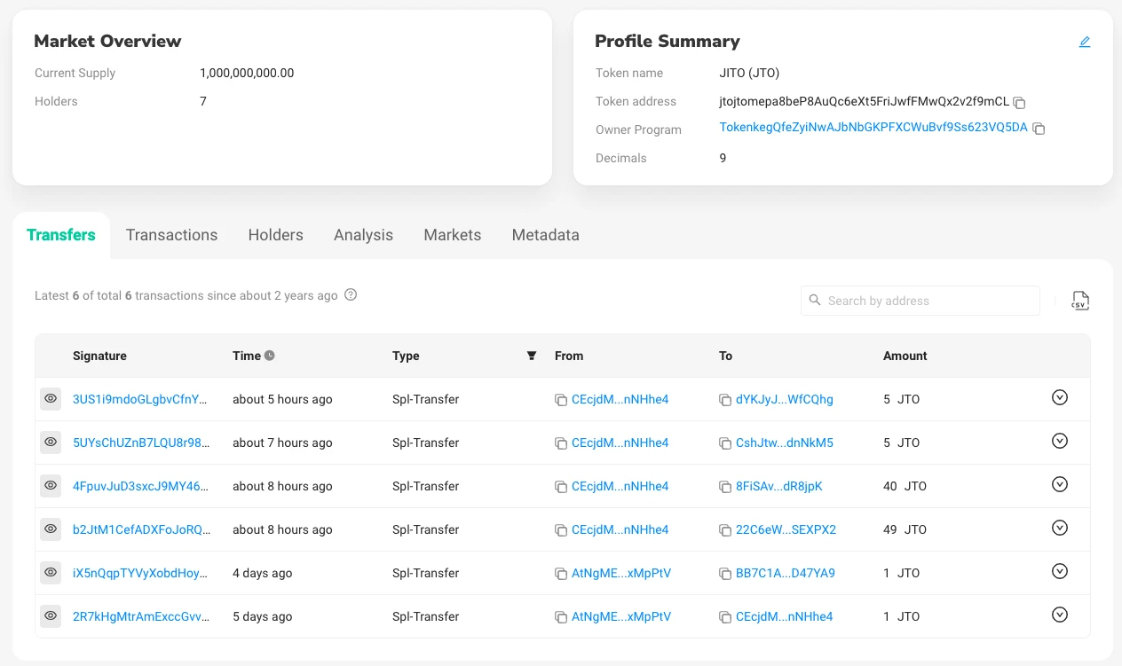根据 Jito 今日早间公布的信息,JTO 代币现已于链上铸造,但当前除了一些小规模的测试性转账之外并未正式流通,代币合约地址为 jtojtomepa8beP8AuQc6eXt5FriJwfFMwQx2v2f9mCL。