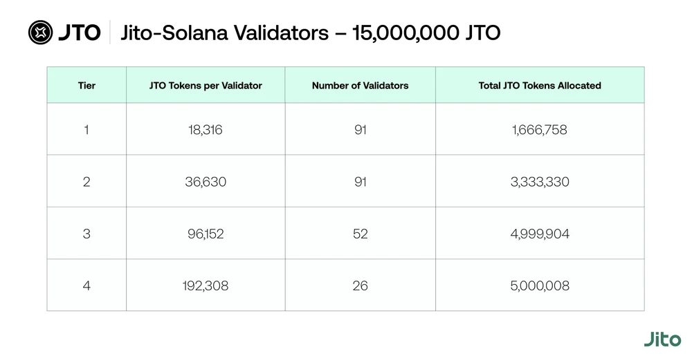 总计 1500 万枚 JTO 将依照以下规则分配给 Jito-Solana 验证者: