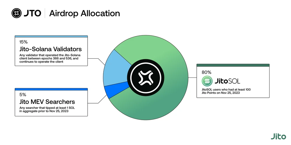 从已公布的分配方案来看,JitoSOL 用户将会获得 80% 的空投额度(8000 万枚 JTO),Jito Solana 验证者将获得 15% (1500 万枚 JTO),Jito MEV 搜索者则将获得另外 5% (500 万枚 JTO)。