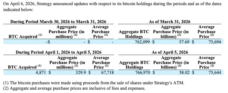 最新动态是,公司更新了其「按市价发行」(ATM)计划,新增了总计 42 亿美元的股票发售额度(包括 STRC 和 MSTR 类别)。仅在 3 月底至 4 月初的几天内,公司就通过出售股票净募集了约 4.74 亿美元,这些资金无疑为后续的比特币购买提供了「弹药」。