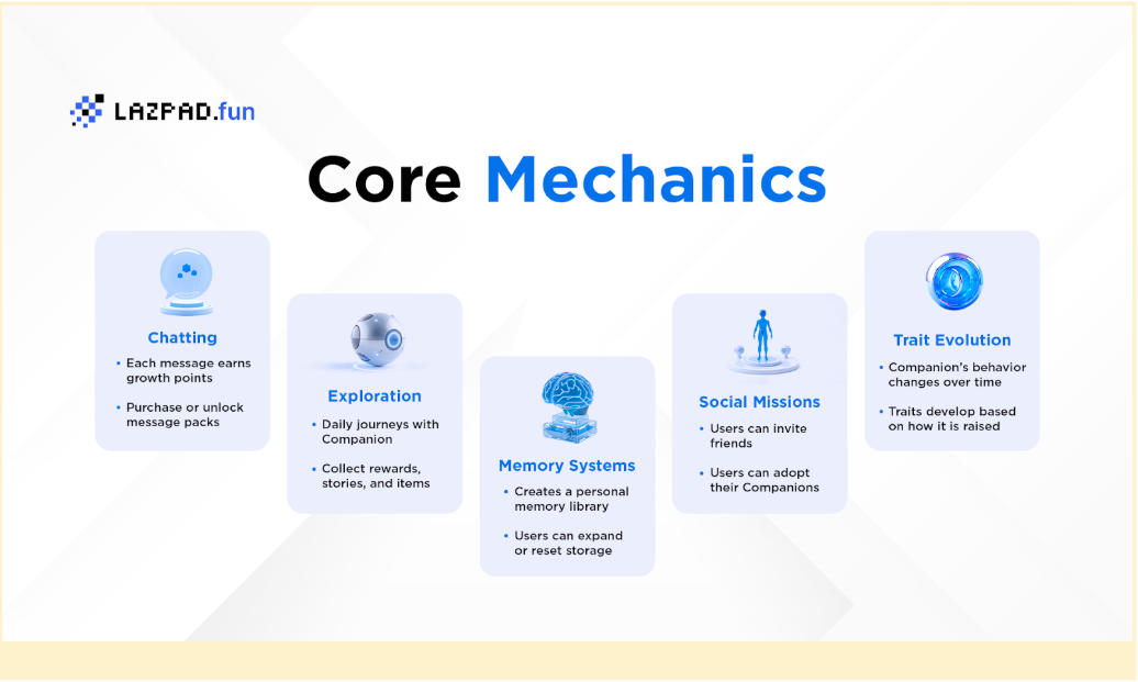 用户可以在LazAI上铸造低成本的 Companion DAT —— 一种独一无二的数字生命体,拥有自己的外貌、性格与故事。通过每日互动、冒险与记忆形成,通过日常对话、冒险与记忆养成,它最终可成长为可交易的全功能数字伙伴。