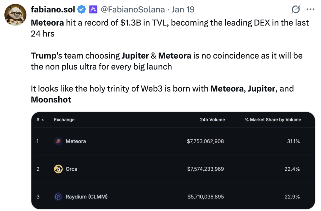 这一套组合拳下来,虽不能说力挽狂澜,但也算是稳住了阵脚,Meteora 开始在 Solana DEX 的竞争中分得一亩三分地,虽然 TVL 持续在 2 至 3 亿美元之间波动,但交易量和在 Solana 上 DEX 总交易量中的占比在逐渐上升。在转型一年之后的 2025 年 1 月,TRUMP 代币的出现更是将 Meteora 的发展向前推动了一大步。