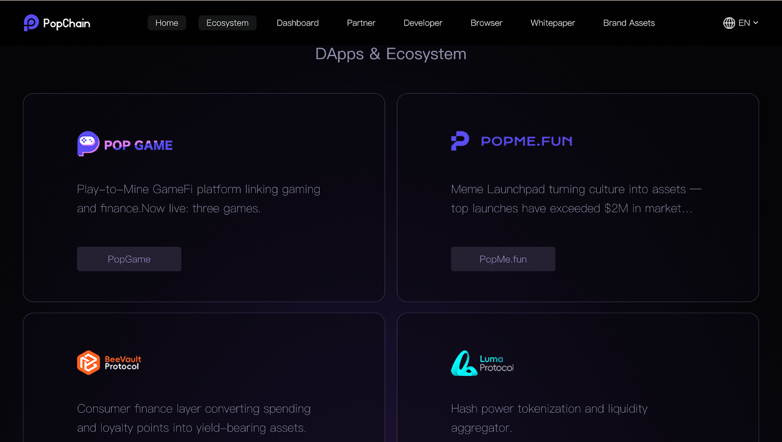 这是官网最核心的部分,展示了 PopChain 生态现有热门项目,以及其如何连接算力、资产与消费: