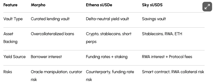 - Morpho、Sky 的 sUSDS 以及 Ethena 的 sUSDe 展示了金库如何涵盖储蓄产品、delta 中性策略和精选借贷等领域,每种都有其独特的收益来源和风险特征。