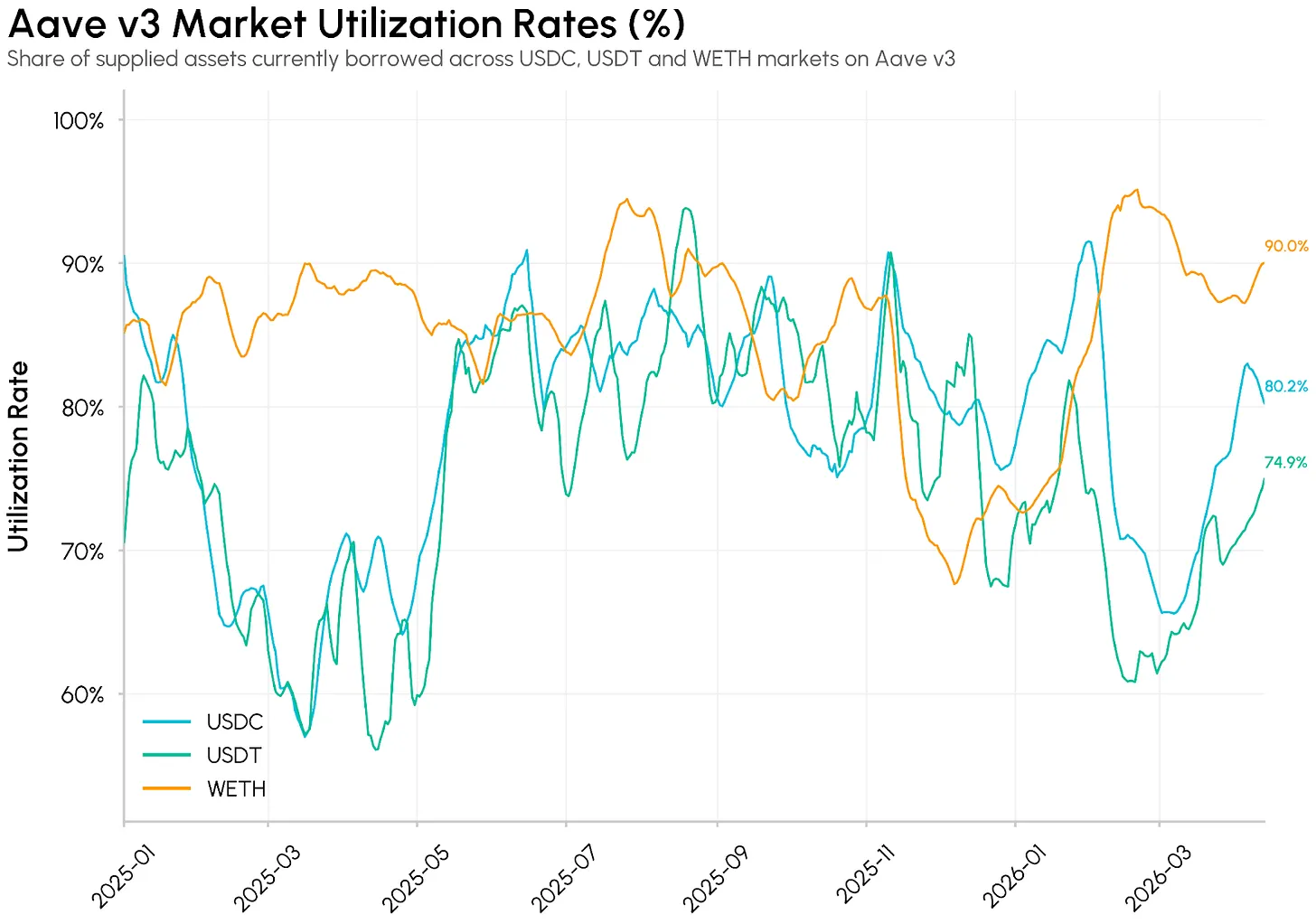 在借贷市场中,当借款需求超过可用供应时,就会出现取款流动性不足的情况。策展人通常会调整供应上限或重新分配资本,利用率和资金池深度是关键输入指标。下图显示了 Aave v3 主要市场的利用率,其中 WETH 市场利用率达到 90%。虽然 Aave 采用不同模型,但它是策展人所面临的流动性和杠杆状况的重要基准。