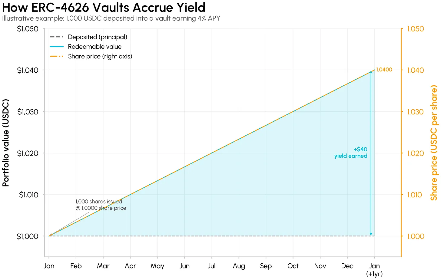- 一年后,按 4% APY 计算,汇率升值为 1.04