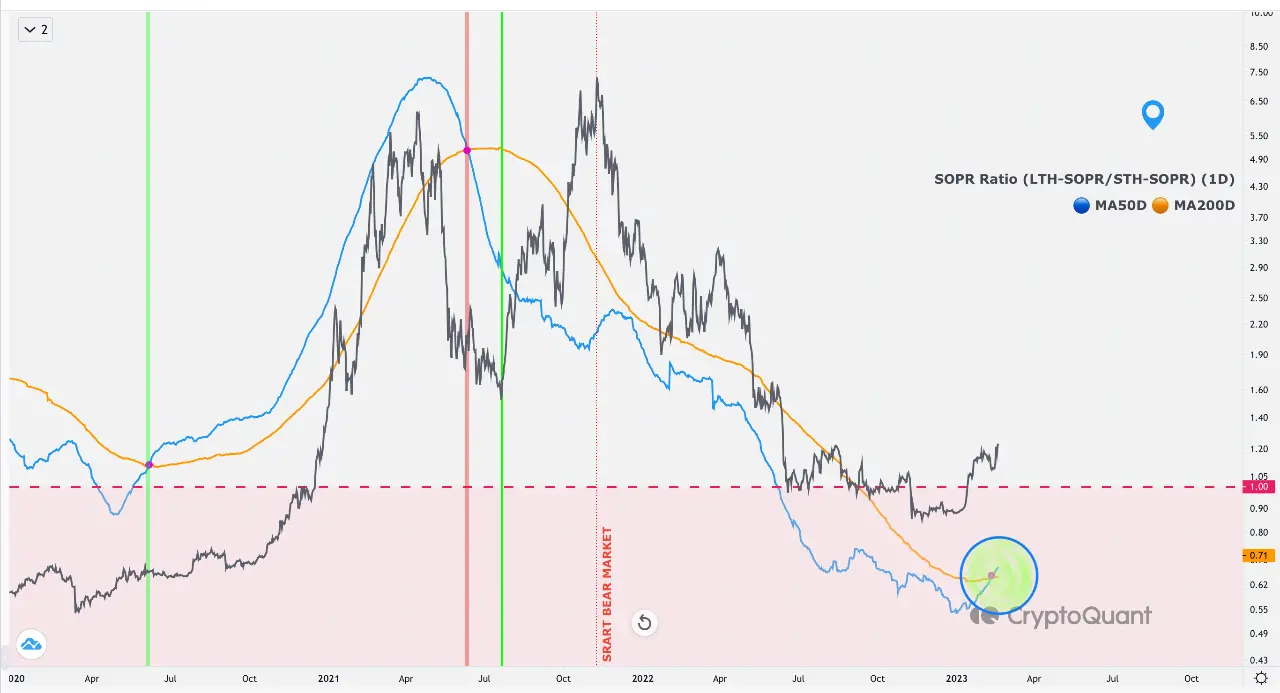 比特币的MVRV比率在1月中旬开始上升到1以上,这表明比特币价格已经见底并进入牛市周期。目前该比率为1.22,仍然较低,投资者可以把握机会。