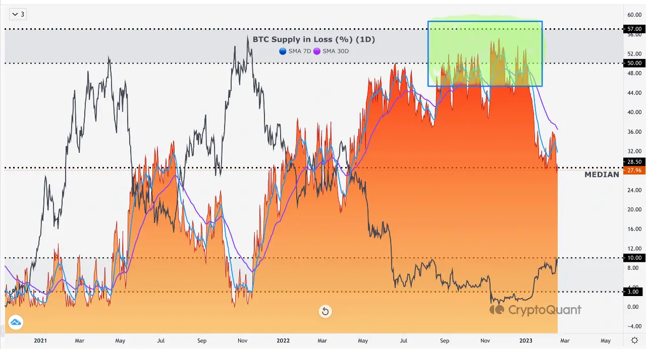 自1月以来,Supply in Loss (%) 正在迅速减少,这表明BTC价格已经见底。