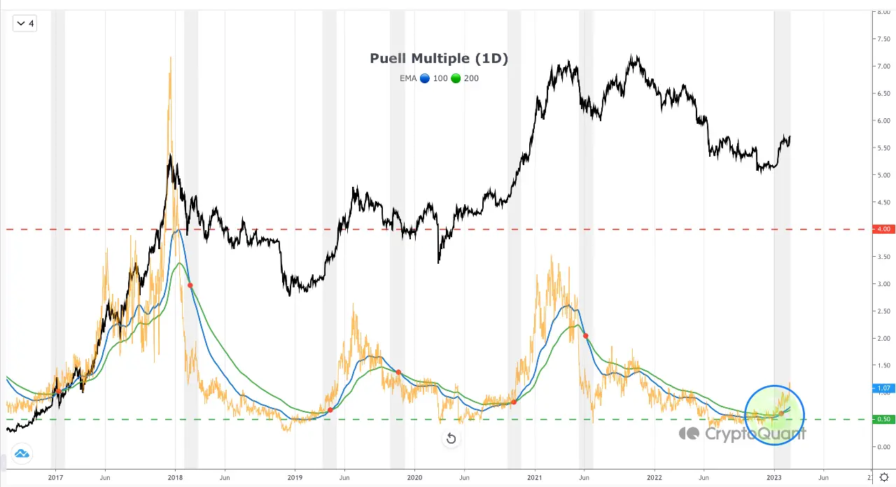 Puell 倍数衡量的是每日发行量与每日发行量的移动平均值的比率。它证实了比特币价格相对于历史发行率是被高估还是低估了。低于0.5的数值表明底部形成。目前,Puell倍数为1.07,表明在1月形成底部后有看涨的势头。