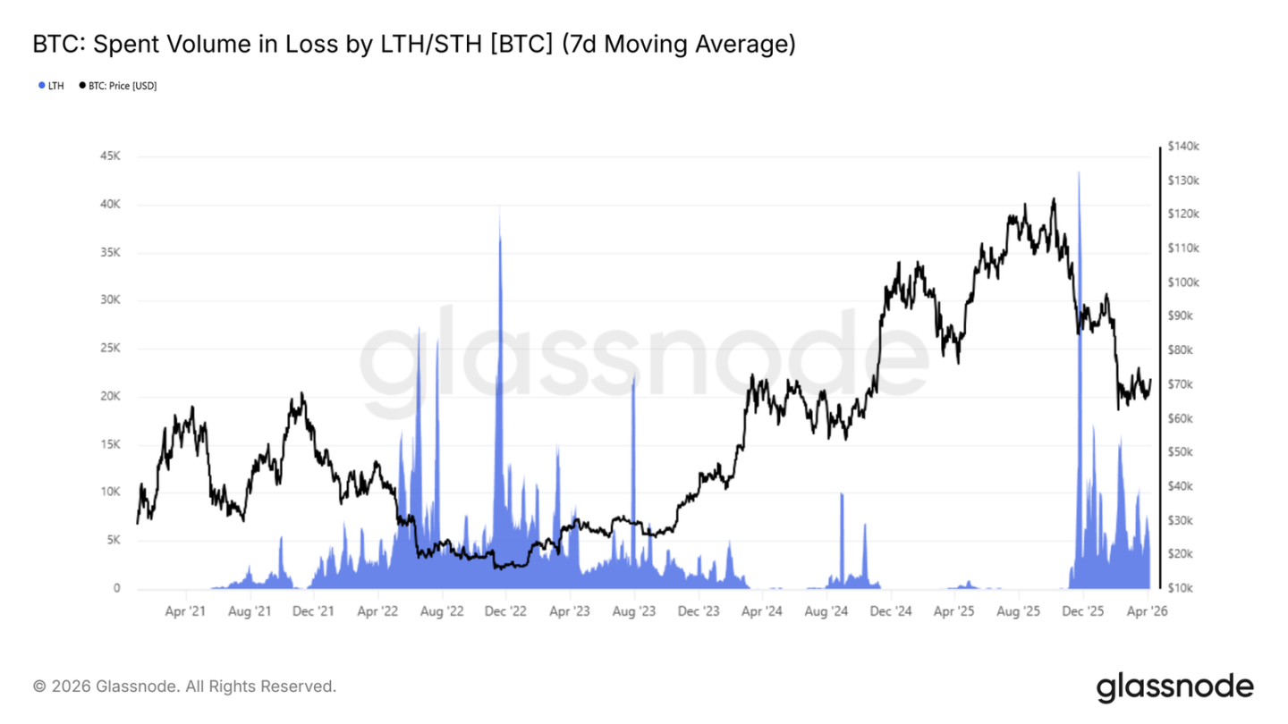 后者可以通过长期持有者已实现亏损量的七天移动平均值来监测。自 2025 年 11 月以来,该指标一直保持在每天四千枚比特币以上。这反映出顶部买入者仍在持续投降,他们尚未消化掉亏损头寸。该指标持续降温至每天低于一千枚比特币,再加上价格重新收复短期持有者成本基线,即 81600 美元,将共同构成最可靠的链上确认信号。这表明当前的熊市阶段正在向牛市前夜的复苏结构过渡。