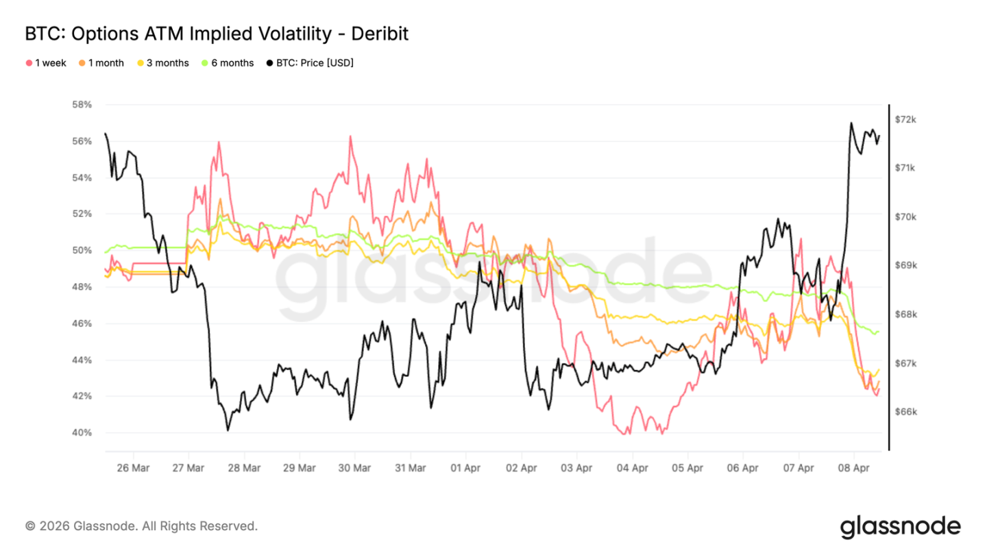 伊朗冲突停火协议的宣布进一步压低了波动率,加速了已经发生的波动率压缩。这一转变表明,市场正在定价一个更为平静的近期环境。冲突有降级迹象,但信心有限,愿意为保护或凸性敞口支付溢价的参与者减少。