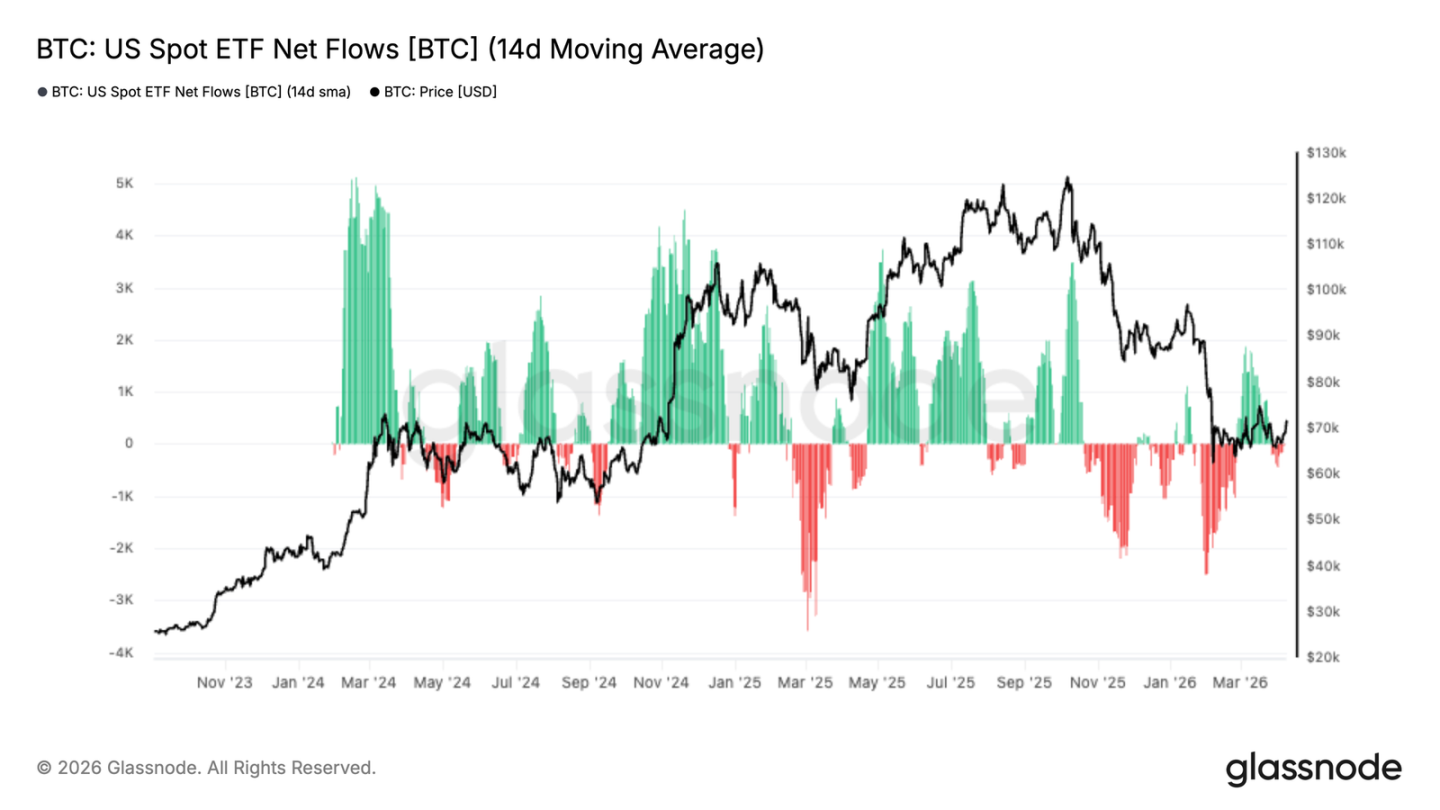 美国现货 ETF 资金流开始改善。十四天平均值在经历了长期的净流出之后,重新转为小幅净流入。这一转变的幅度仍然很小,但在方向上很重要。