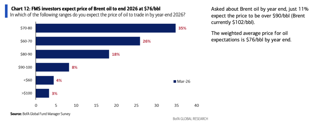 对于大宗商品市场,基金经理的油价预判与当前市价存在显著落差。调查显示,仅 11% 的受访者预计布伦特原油年底价格将超过每桶 90 美元(调查期间布伦特油价约为每桶 102 美元),加权平均预期价格为每桶 76 美元,隐含约 26% 的下行空间,折射出市场对地缘政治溢价难以持续的普遍判断。