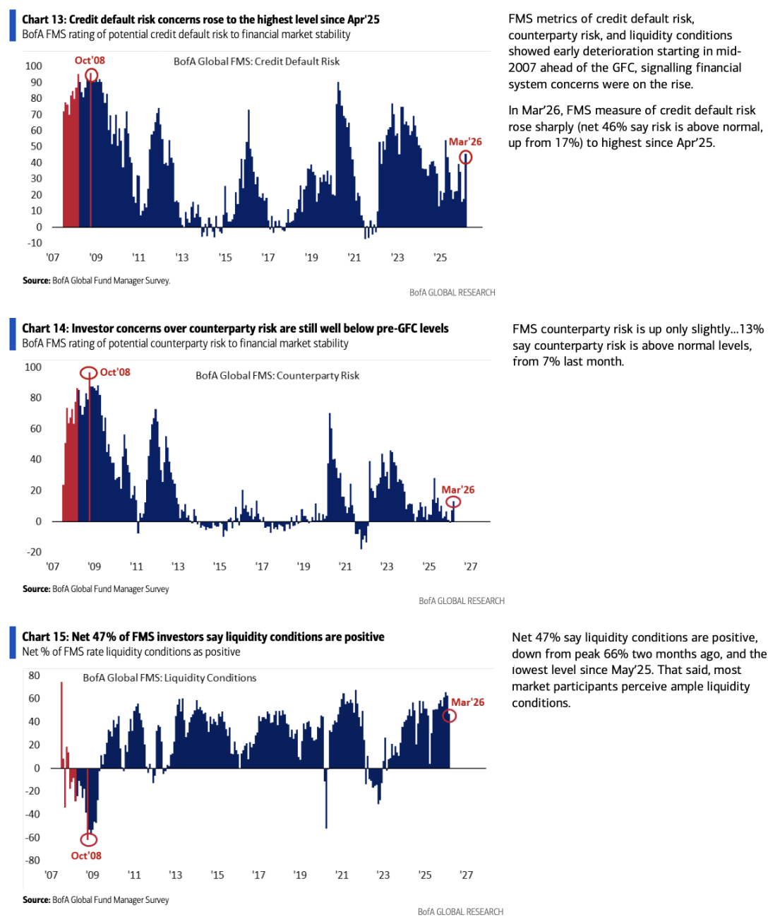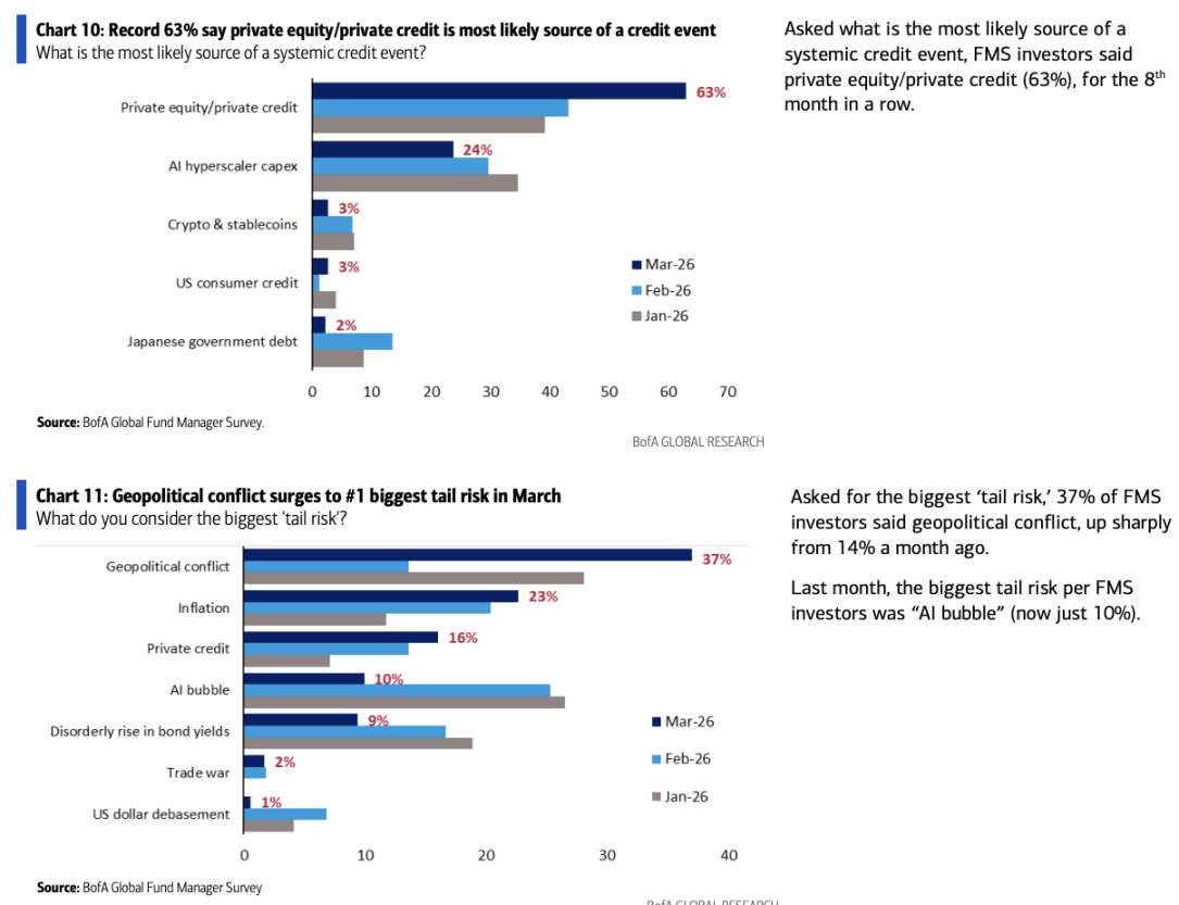 在系统性信用风险的来源判断上,63% 的受访者将私募信贷列为最可能引爆系统性信用事件的领域,这一比例创下调查有史以来最高纪录。与此同时,3 月信用违约风险指标急升至 2025 年 4 月以来最高,净 46% 的受访者认为违约风险高于正常水平,而上月这一比例仅为 17%。
