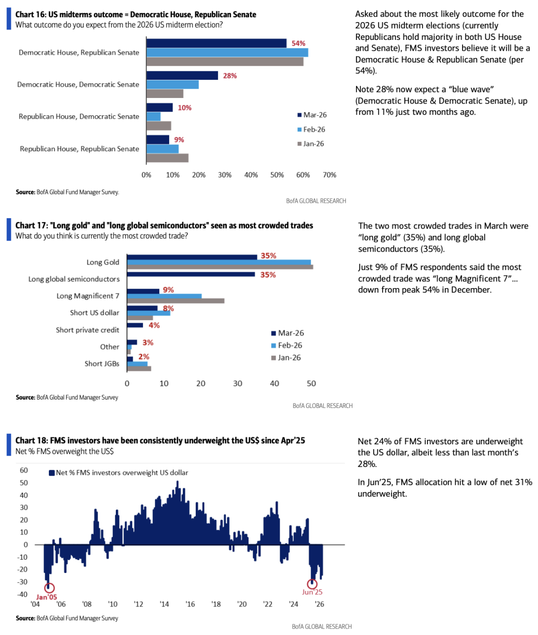 在政治层面,美国 2026 年中期选举的预期正在发生悄然变化。54% 的受访者预计选举结果为「民主党控制众议院、共和党控制参议院」;但预期民主党全面横扫(同时控制众参两院)的比例已从两个月前的 11% 升至 28%,政治风险的市场定价正在悄然调整。