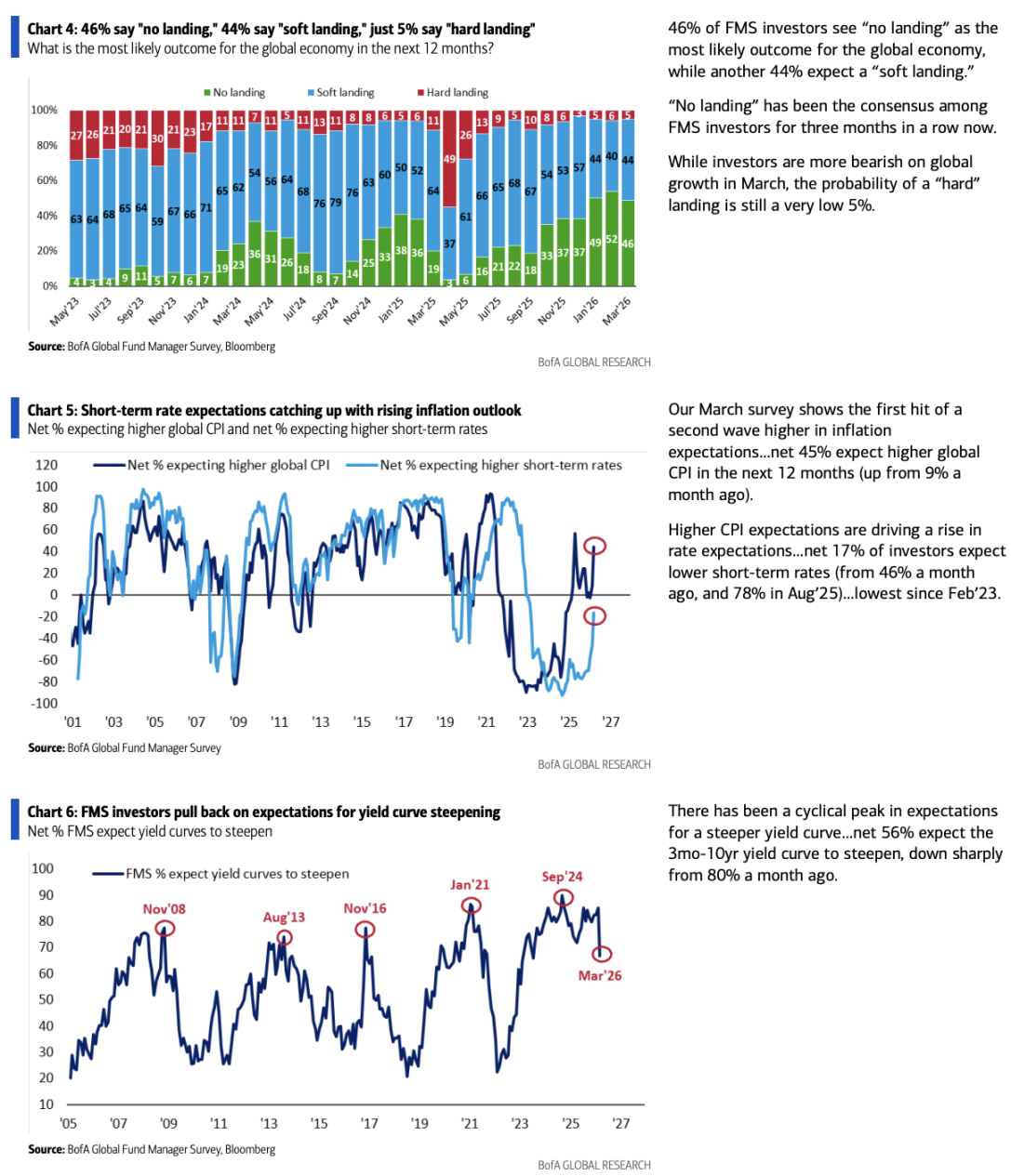 宏观预期的逆转是本次调查最引人注目的变化。全球经济增长乐观比例从上月净 39% 断崖式下跌至净 7%,为近期最大单月跌幅。与此同时,通胀预期大幅反弹——净 45% 的受访者预计未来 12 个月全球 CPI 走高,而上月这一比例仅为 9%。