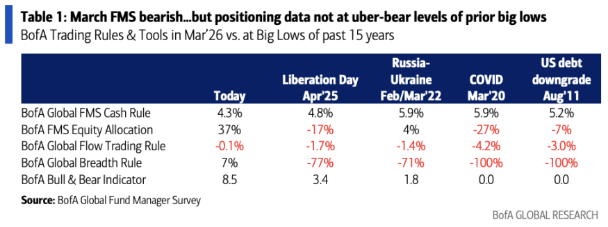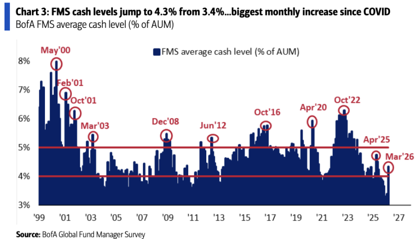据美国银行(BofA)3 月全球基金经理调查(FMS),本月情绪综合指标从 8.2 骤降至 5.6,创六个月新低。与此同时,现金占比从 3.4% 跳升至 4.3%,为 2020 年 3 月新冠疫情冲击以来最大单月涨幅,此前触发反向「卖出信号」的现金规则已回归中性区间。