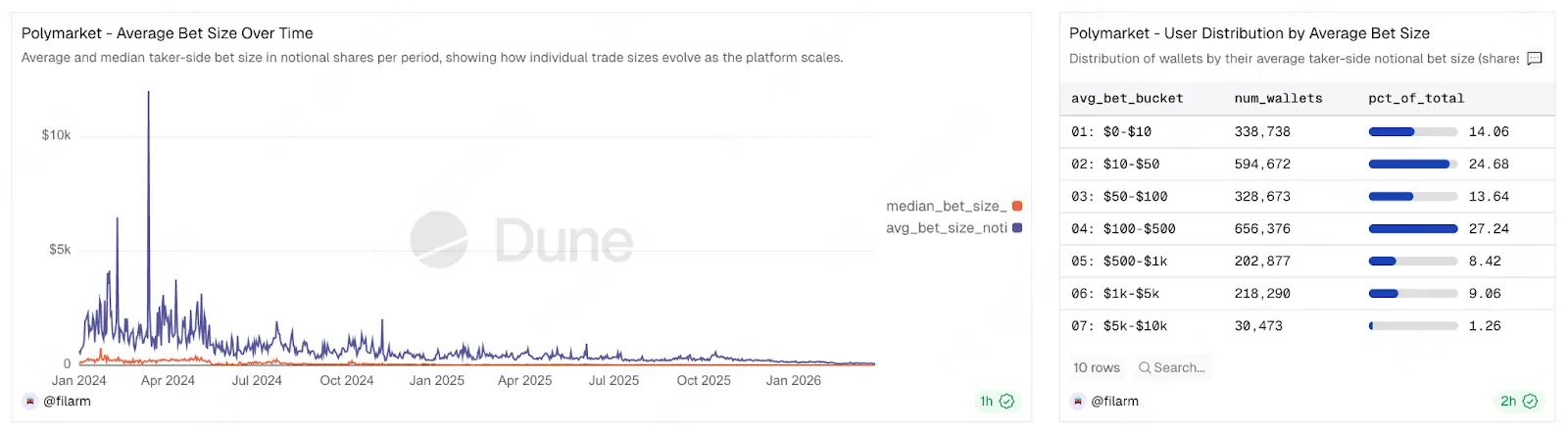 另外,在这一波规范背后,存在 Polymarket 无法回避的矛盾:Polymarket 的流动性并非天然形成。根据链上数据显示,平台上 80% 的用户单次投注金额不足 500 美元,过去一个月的平均单次投注金额仅约 100 美金上下,因此真正支撑起市场深度的,是极少数的大型交易者与流动性提供者。