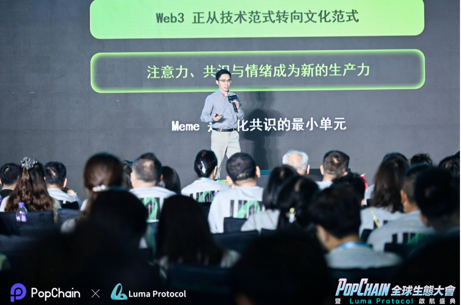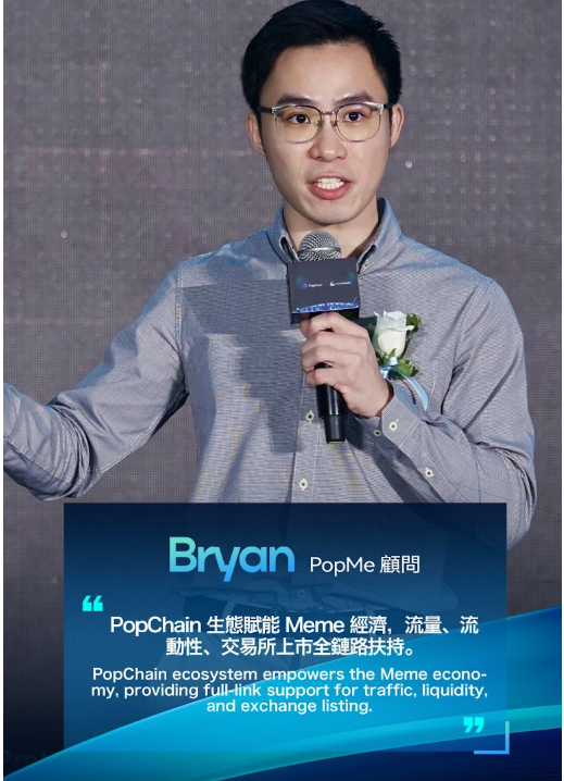 作为 PopChain 生态的重点项目之一,PopMe.Fun 顾问 Bryan 在会上发表了主题演讲《PopMe.Fun:下一波 Meme 创作者的发射器》,并成为全场焦点。