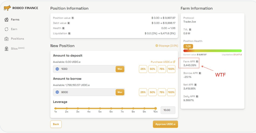 1)Rodeo 简化了进入杠杆头寸的过程,并减少了方向风险,通过让用户存入 USDC 并借出USDC,Rodeo 减少了方向风险。