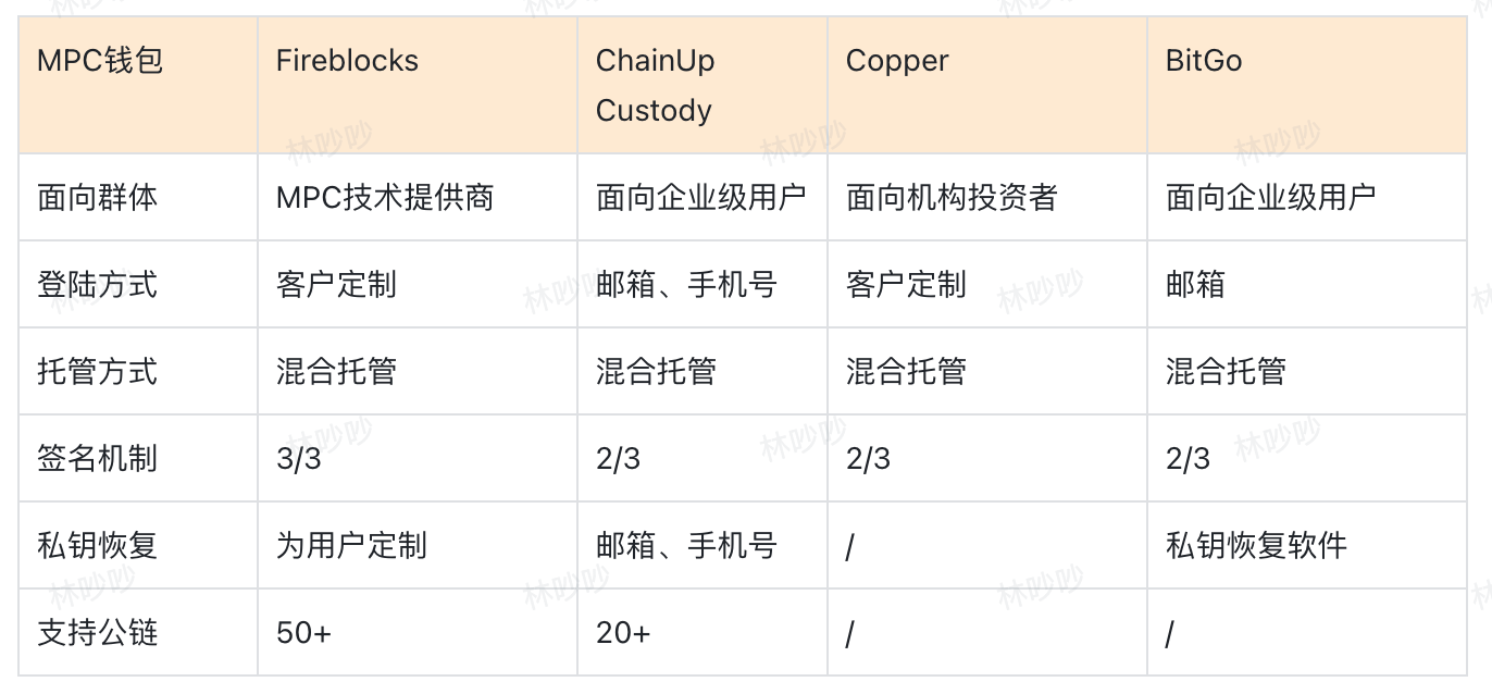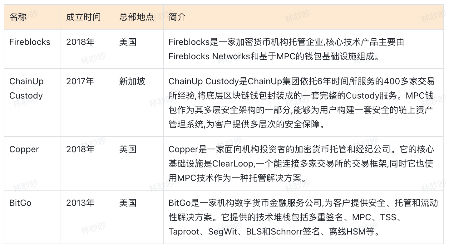 我们刚刚成立了一个传统的竞争对手、资历较老的四家公司,包括Fireblocks、ChainUp Custody、Copper、BitGo。这些公司都提供数字货币托管服务,在近几年创业推出了MPC钱包解决方案,以下是关于它们的简要介绍: