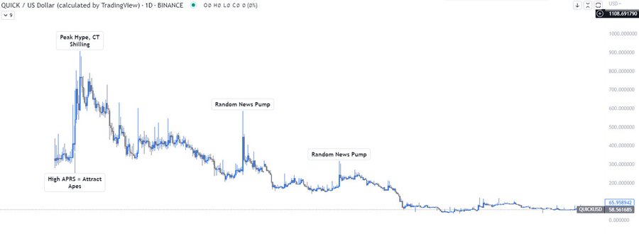 要获得高效的收益,你的目标应该是白嫖大家都看好的代币,或者是通过挖矿和出售(提挖卖)来获得收益。 很多矿币最终都会以下面这种情况结束(以QUICK代币为例)。 今天我们不是要探讨挖矿平台的运营和技术,不过在参与一个收益协议之前,可以通过以下的框架来进行一些考虑和权衡。