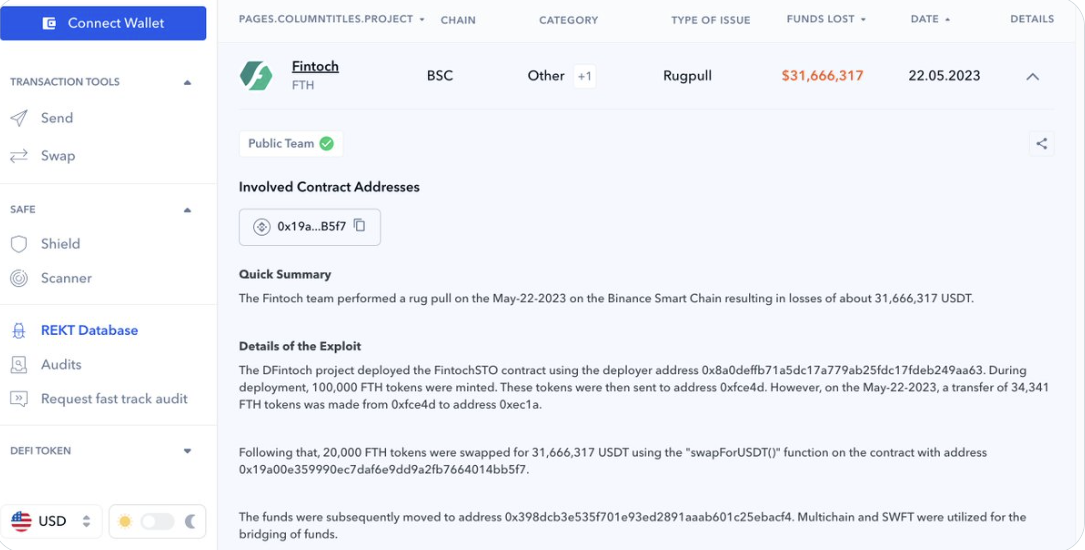De.Fi 的 REKT 数据库为我们提供了有关此欺诈行为的相关详细信息,例如:
