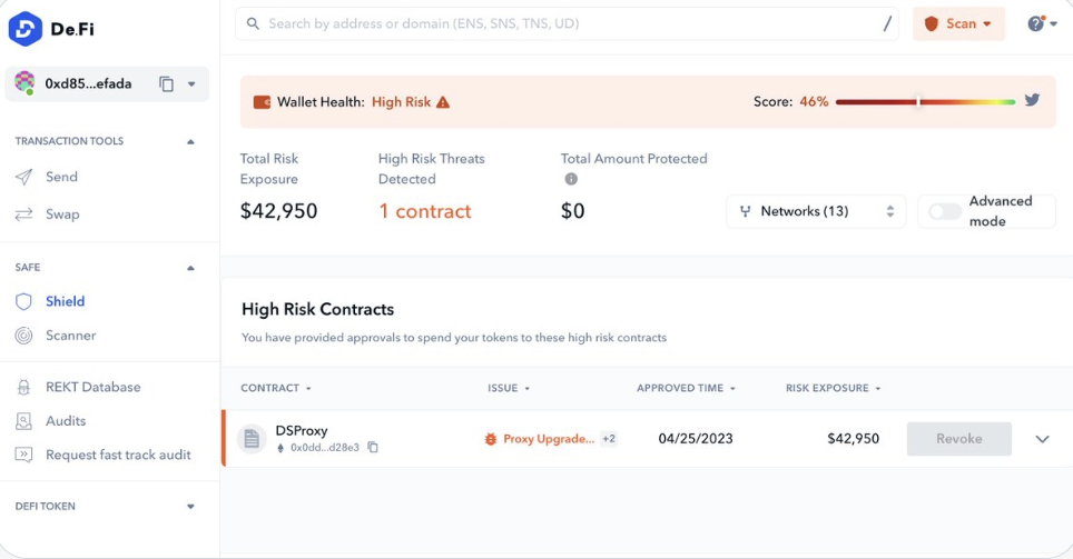Shield 是由 De.Fi 开发的一款防病毒工具,用于扫描您的钱包中可能存在的危险代币和授权。如果您持有的任何代币存在高危代码问题且属于高风险类别,则该工具将通知您。