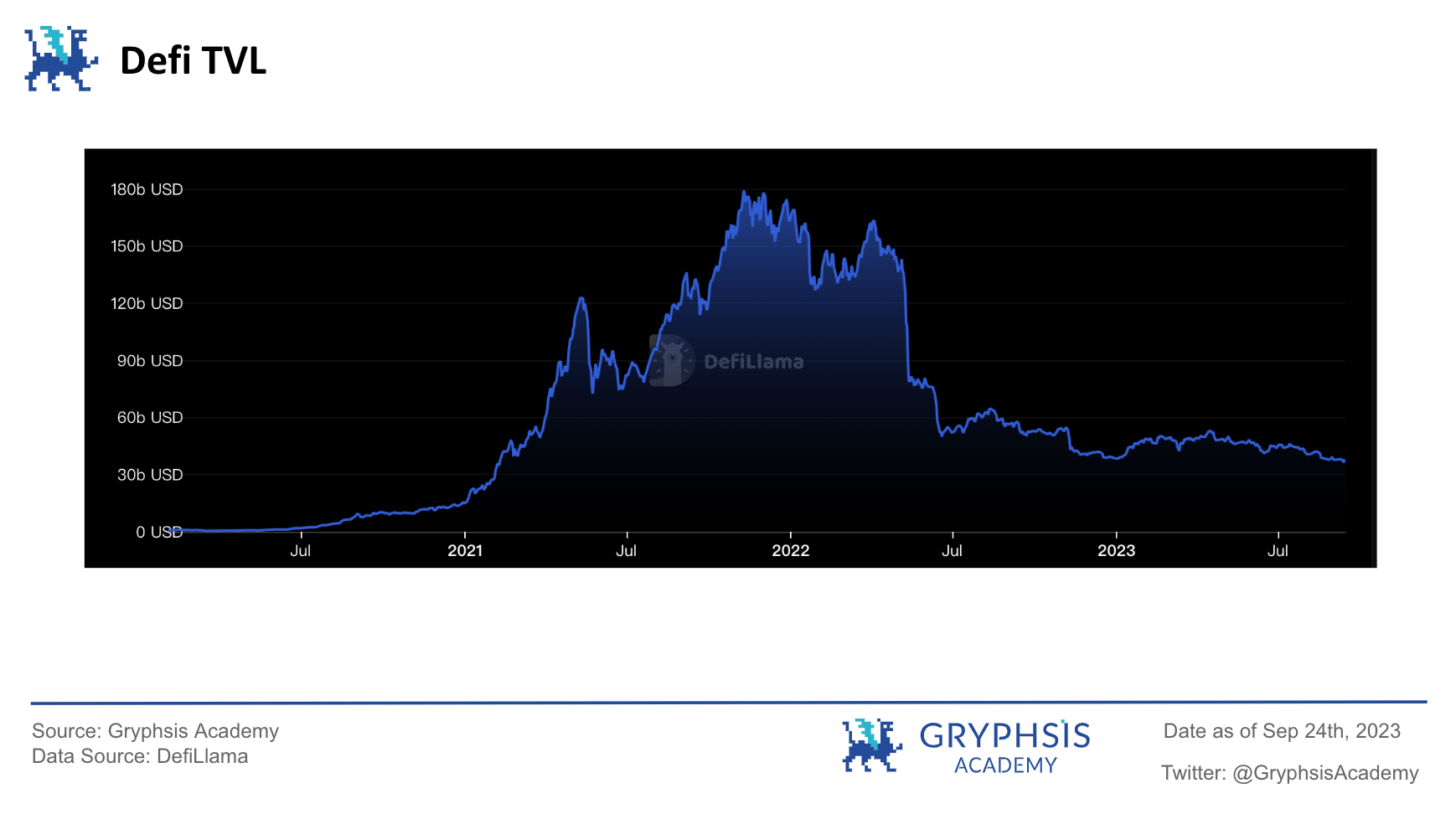 由上图 Defi TVL 数据可以看到,自 2022 年 5 月 UST 脱钩引发市场恐慌和大量抛售后,Defi 板块的 TVL 一直呈现下滑趋势,目前项目和叙事很难再吸引场外资金,需要引入新的叙事结构和参与者,借鉴上面提到的 RWA 特点,现实世界资产上链提供真实的资产价值可能是目前最好的解决方案。