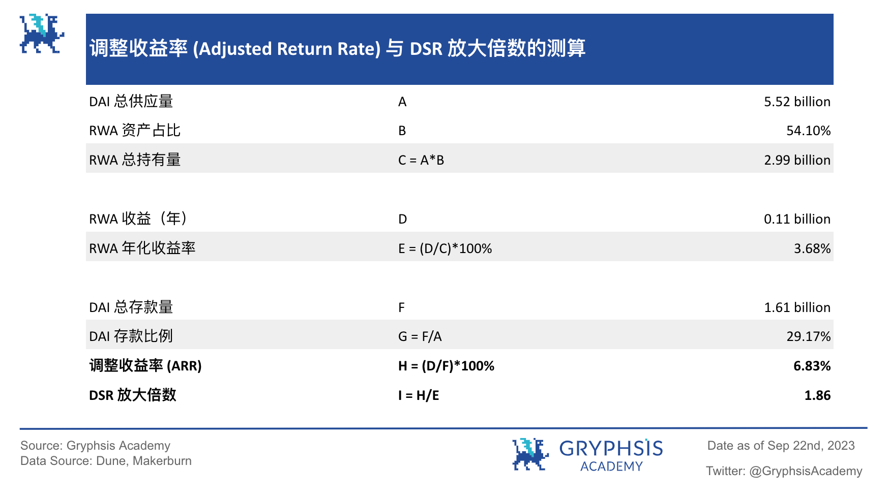 如上表,调整收益率(ARR, Adjusted Return Rate)是通过将RWA的年收益(D, 0.11 billion)除以 DAI 的总存款量(F, 1.61 billion)来计算的,这个调整收益率可以看作是按照现在的存款比例和 RWA 年收益来说, DAI 存款者通过 MakerDAO 平台理论上能够获得的一种收益率,尽管它是间接通过RWA资产实现的。另外,DSR(Dai Savings Rate)放大倍数是通过将调整收益率(ARR)除以 RWA 的年化收益率(E, 3.68%)来计算的,这个比率反映了通过 DSR 机制,DAI存款者能够获得的收益率相对于直接持有RWA资产的增加倍数。DSR 放大倍数为 1.86 则表示通过DSR机制,DAI存款者能够实现接近两倍于直接持有RWA资产的年化收益率。这个放大倍数显示了 DSR 机制为 DAI 存款者提供的潜在价值和收益优势。在这种情况下,DSR 机制似乎为 DAI 存款者提供了更高的收益率,使他们能够在一年的时间里实现更好的投资回报。