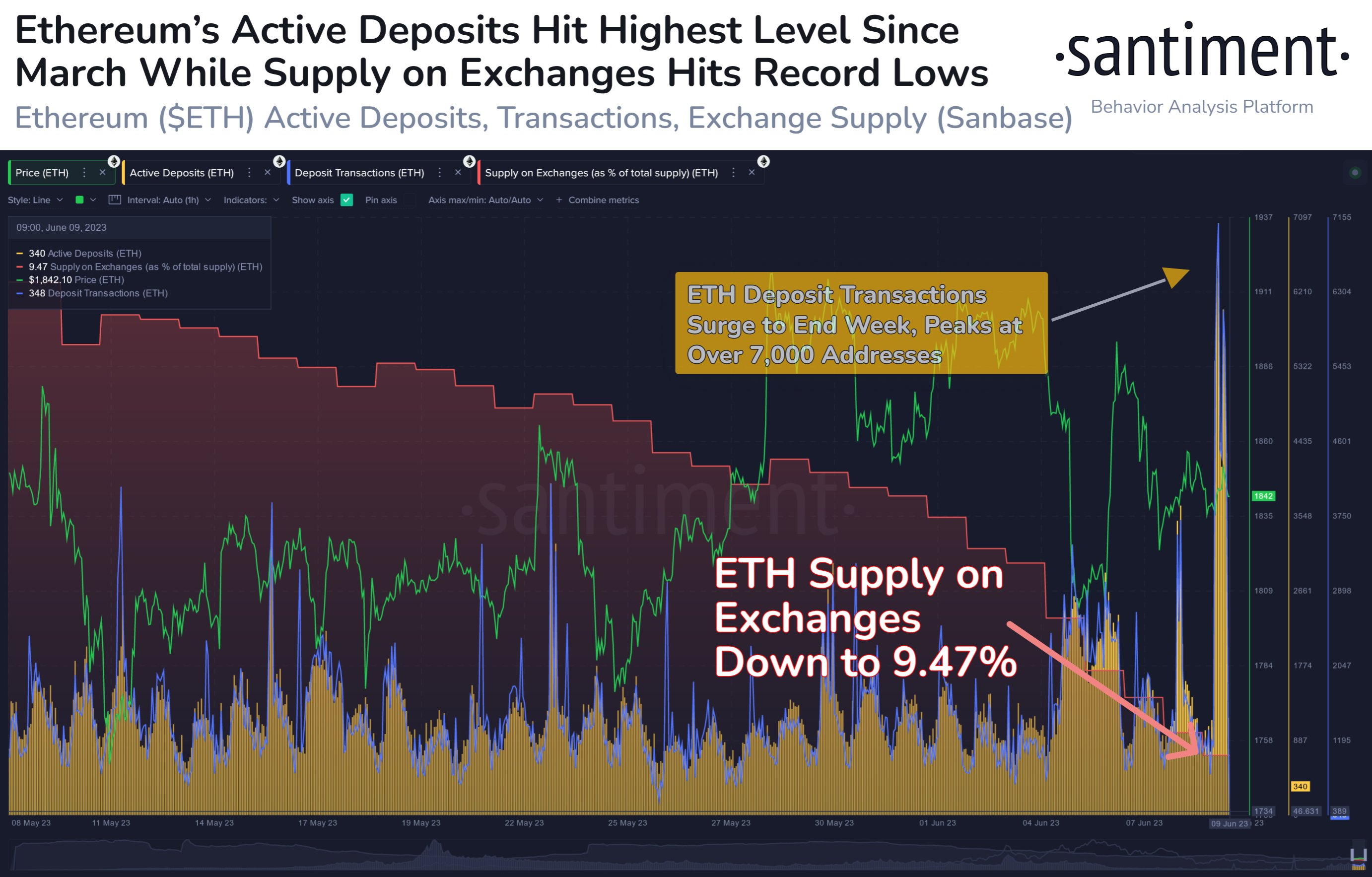 交易所上可用的 ETH 数量创下历史新低,目前仅为 9.47%。