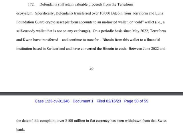 根据起诉书显示,Do Kwon和Terraform将超过1万个比特币放入一个所谓的冷钱包,该钱包不在任何数字资产交易所。