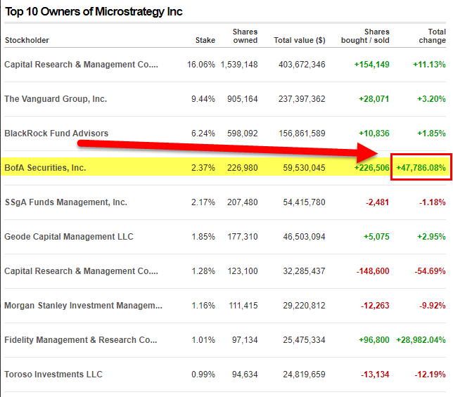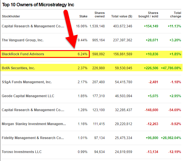 虽然美国银行可能持有 MSTR 2.37% 的股权,但 BlackRock 持有 MSTR 的股权却是它的三倍!有趣的是,贝莱德持有 MSTR 6% 的股份,价值超过 1.56 亿美元……