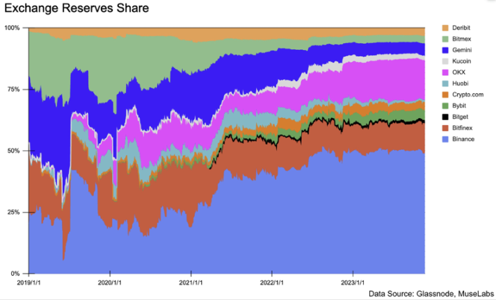 一方面,就市场占有率而言,虽然近两年受到了包括 FTX 暴雷、美国证券交易委员会(SEC)起诉、美国商品期货交易委员会(CFTC)起诉、美国司法部调查等事件的影响,但目前币安的交易份额和储备资产价值的市场占有率仍维持在 50% 附近,「交易所一哥」的身份仍旧没有被撼动。
