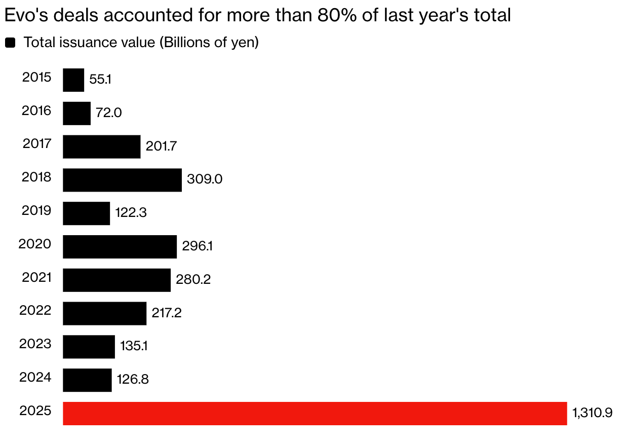 根据日本 I-N 信息系统公司的数据,Evo 与 Metaplanet 的一系列交易,让 2025 年成为日本浮动行权权证发行量史上最高的一年。Lerch 旗下基金去年在日本达成的此类金融交易总额超 1 万亿日元(折合 63 亿美元),占据全市场总规模的 80% 以上。