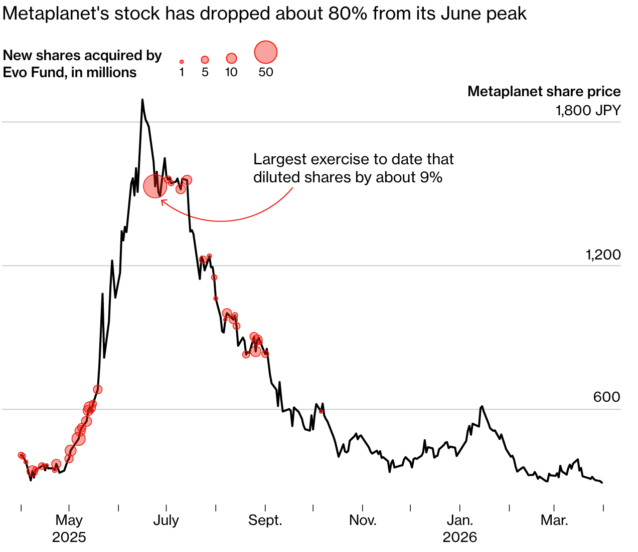 在前期暴涨超 2000% 后,Metaplanet 股价自 6 月中旬高点至今暴跌约 80%。自 2025 年 10 月起,Metaplanet 寻求其他融资渠道,Evo 便不再对其进行权证行权。