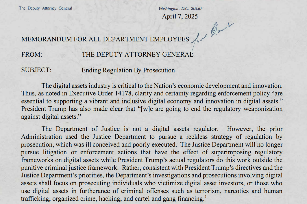 这份备忘录做了几件事:解散了专门追查加密犯罪的国家加密货币执法团队(NCET);指示各地检察官停止追究加密公司的监管违规案件;明确声明「司法部不是数字资产监管机构」,不再针对交易所、钱包服务和混币工具因用户行为而承担的连带责任。