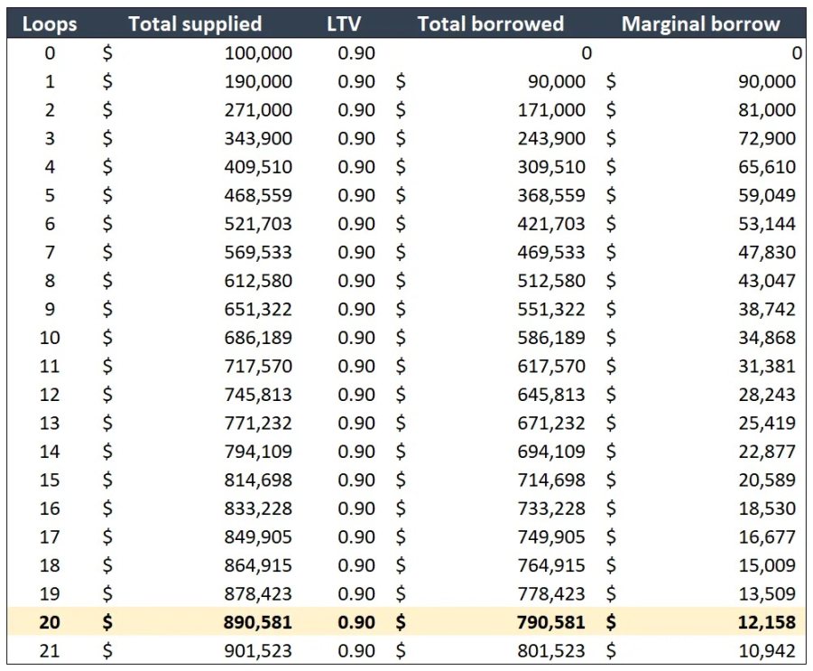 将这 9 万美元 USDe 再次存入作为抵押品,借出 8.1 万美元 USDT,并兑换成 USDe。重复上述兑换和借贷流程 20 次。20 轮循环后,你的剩余借贷额度为 1 万美元。恭喜,你就这样创造出了「魔法般的网络货币」。