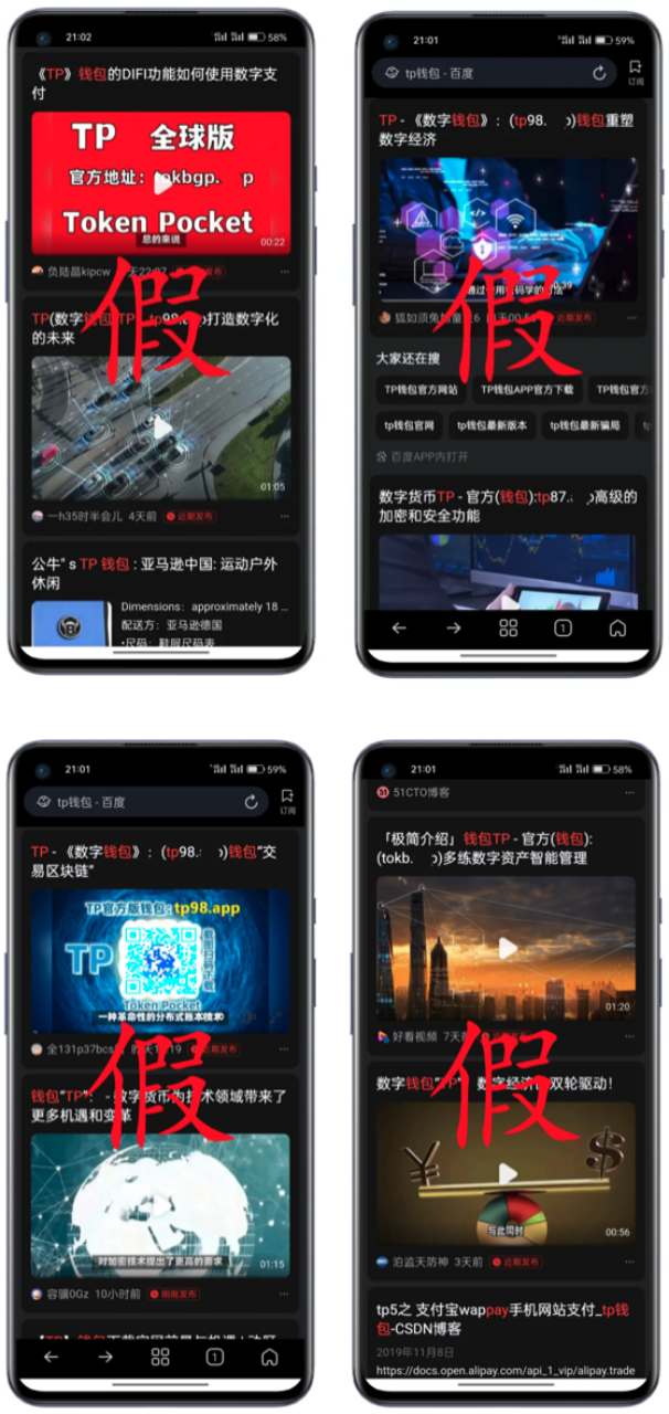 由于很多手机不支持 Google Play 或者因为网络问题,很多人会从其他途径下载钱包,比如第三方下载站,或者直接用浏览器搜索某钱包,然后随机点进一个排名靠前的链接,这样大概率会下载到一个假钱包,因为搜索引擎的广告位及自然流量是可以买到的,骗子可以通过购买排名靠前的广告位,伪造一个假钱包官网,诱骗用户访问。下图为使用百度搜索 TP 钱包的结果: