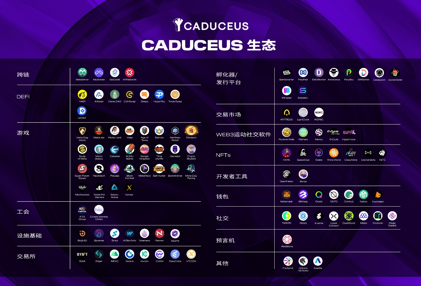 公链生态是其核心价值源,根据官方披露的数据显示,Caduceus生态目前已有112个项目搭建,包括DeFi、基础设施、Web3、NFT、GameFi等一系列项目,本文对其中部分有望成为独角兽的项目进行相关评估。