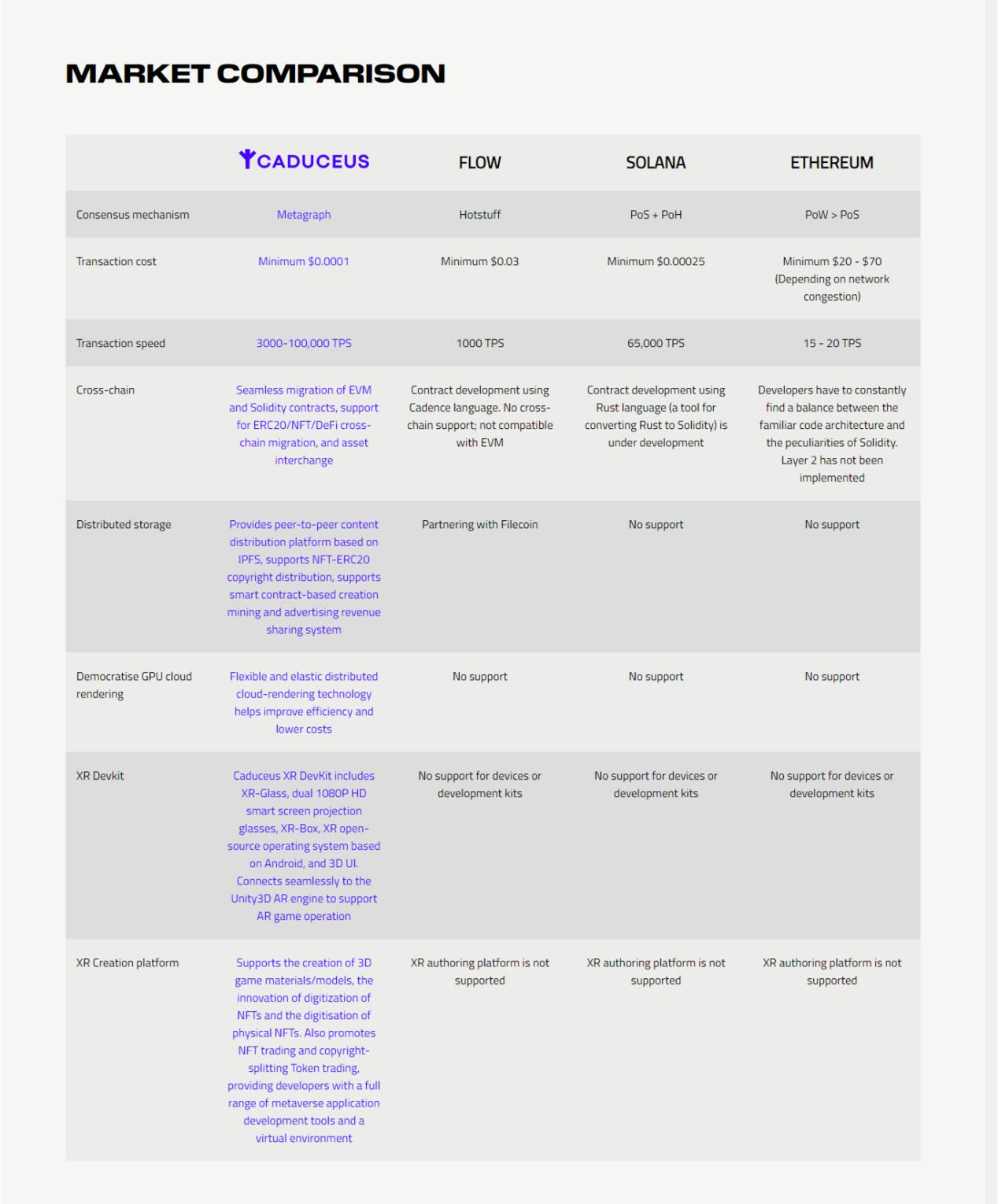 下图是通过共识机制、交易、跨链、工具等多个方面将 Caduceus 与Ethereum、Solana、Flow等进行对比: