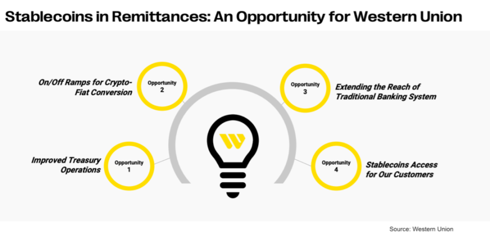 • 对于 Western Union 这样巨型的资金搬运通道,企业端实时结算与企业财务的影响;资金流的即时性;风险与流动性管理的彻底升级,这三个问题能够通过稳定币的方式,完美解决。