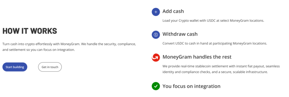 MoneyGram Ramps 的定位是:让任何应用、任何钱包,只要接入 MoneyGram 的接口,就能使用其作为「现金入口(cash-in)」和「现金出口(cash-out)」。这意味着用户可以通过 MoneyGram 的网络将现金兑换成稳定币,也可以在任意支持地区将稳定币兑换成现金。
