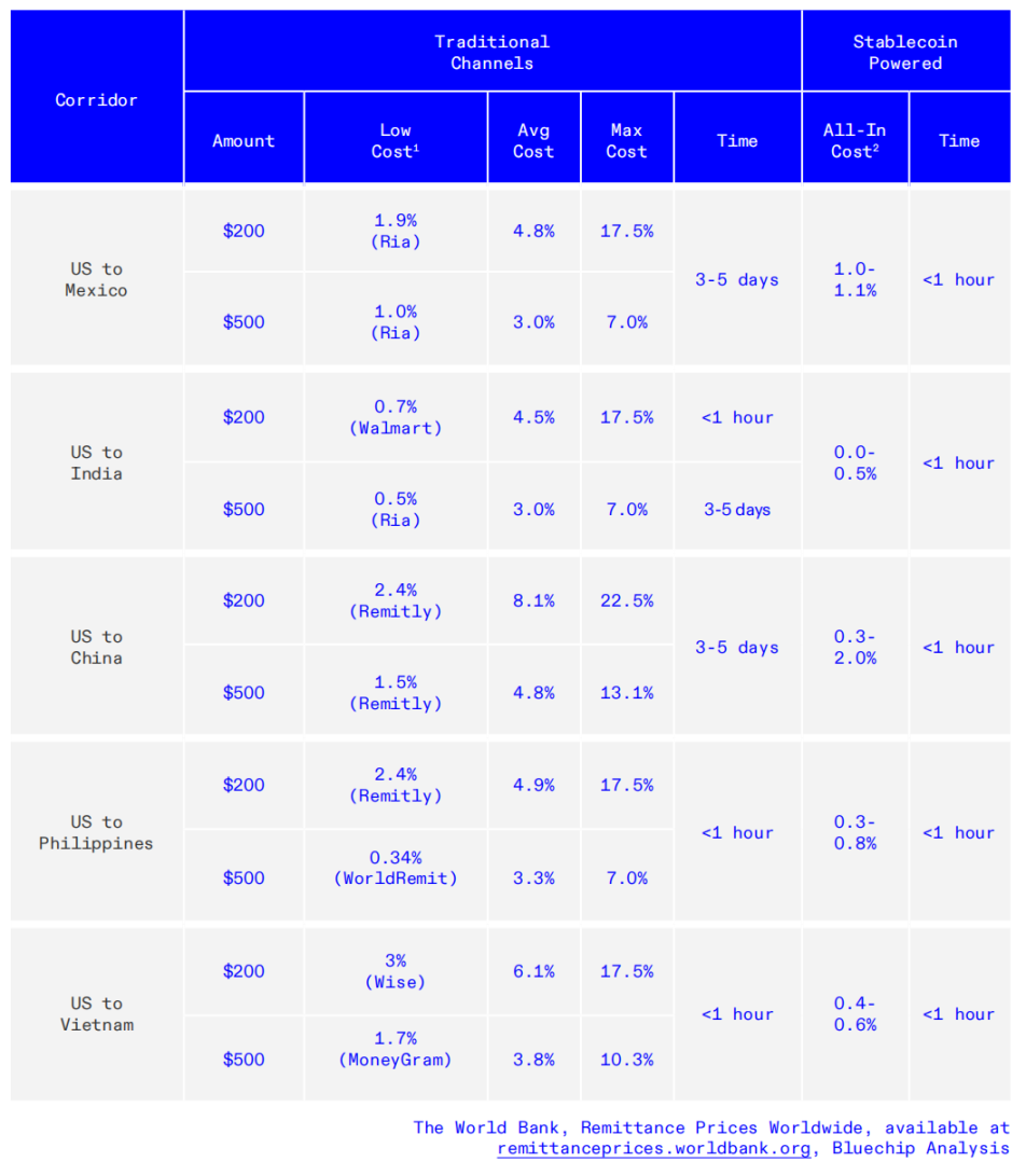 稳定币在许多通道中都能降低成本,包括一些成熟的通道。平均成本与最低传统成本之间的差距表明定价存在差异。在许多通道中,传统转账的平均成本比最便宜的可用提供商高出两到五倍。这一差距代表了汇款运营商相对于银行的优势。然而,稳定币转账经常同时低于两者。