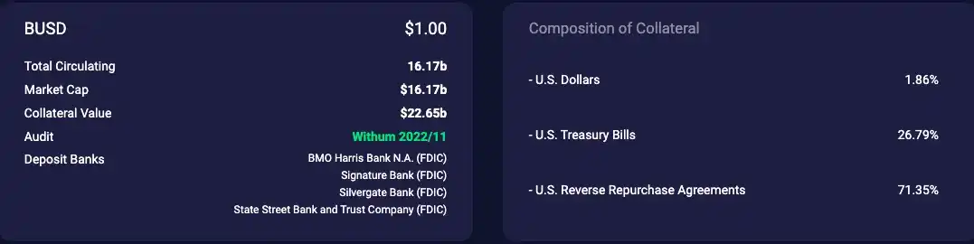 BUSD 是由 Paxos 信托公司发行并托管的一种美元担保的稳定资产,供应量按 1:1 的比率与美元挂钩,由纽约州金融服务部监管。