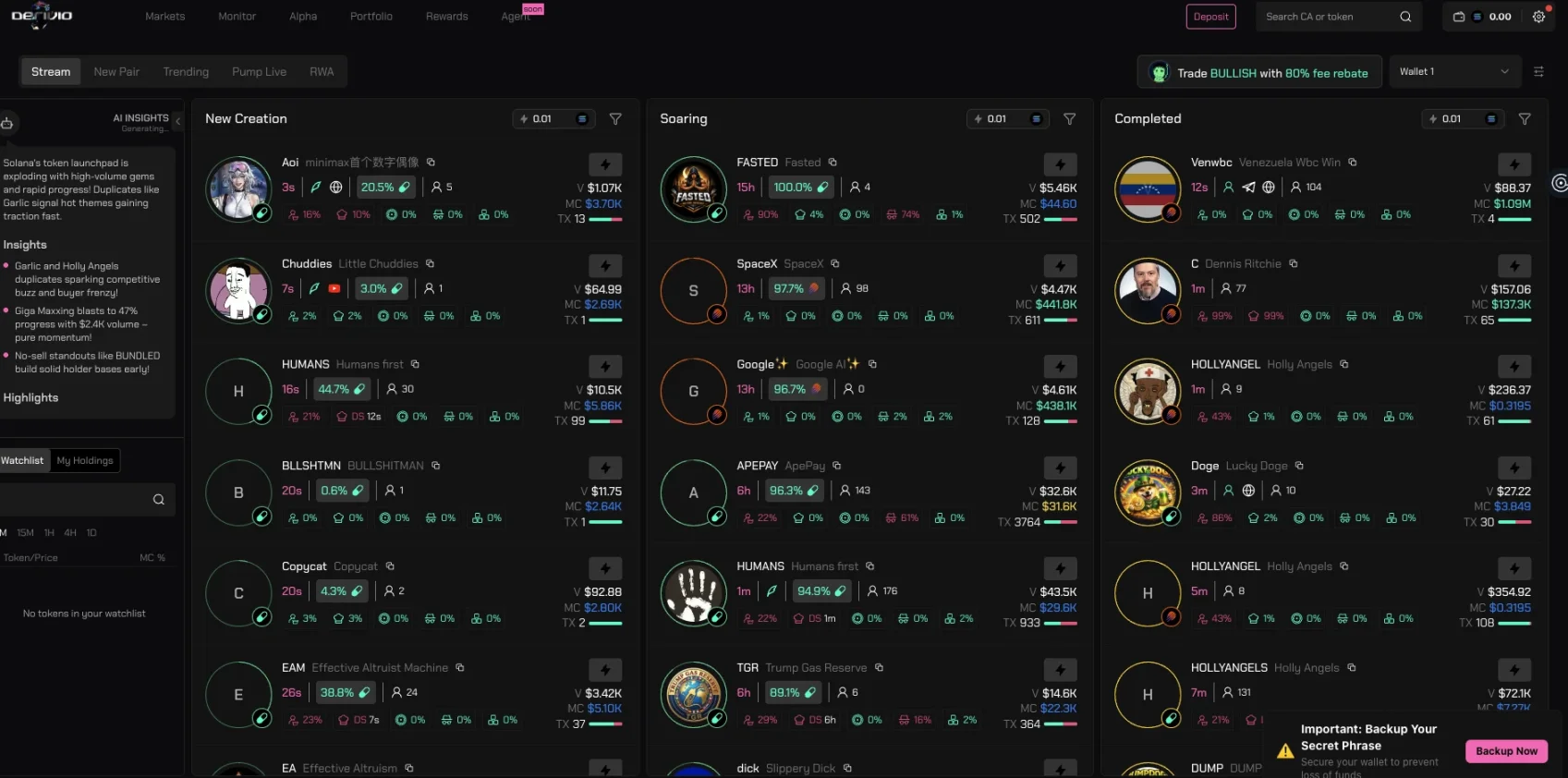 如今,如果你点进 Derivio 的网站,映入眼帘的不是交易 k 线图,也不是 DEX 通常的 Swap 页面,而是 Pump.fun 的扫链监控。