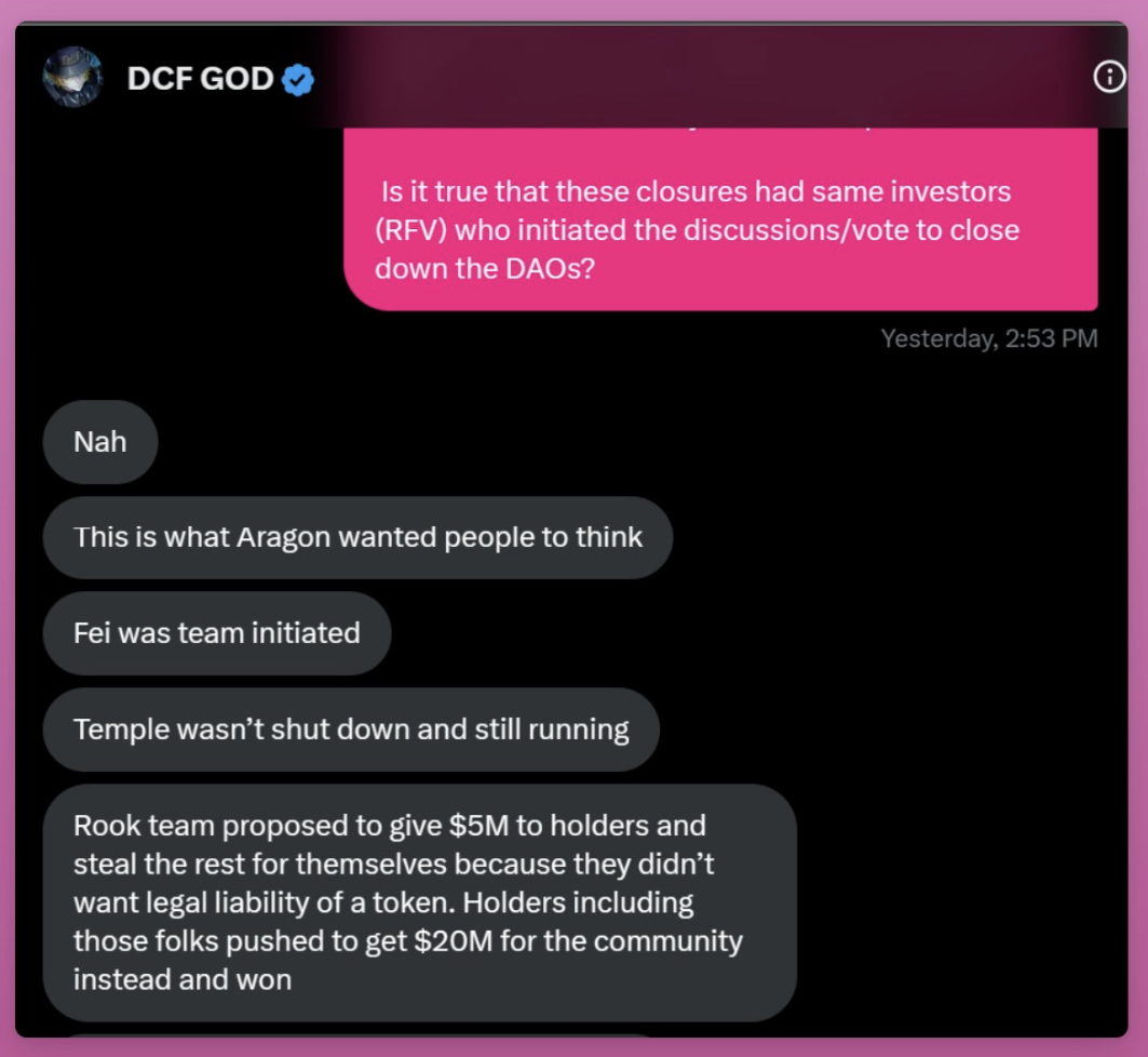 Aragon声称RFV突袭者和Arca负责Rook DAO、Invictus DAO、Fei Protocol、Rome DAO和Temple DAO。无法证实这些说法,我询问了RFV突袭者的支持者@dcfgod的看法。他这样说: