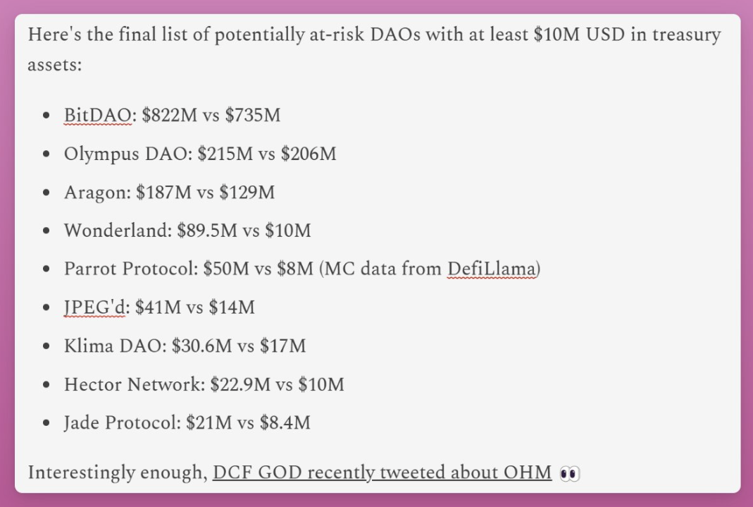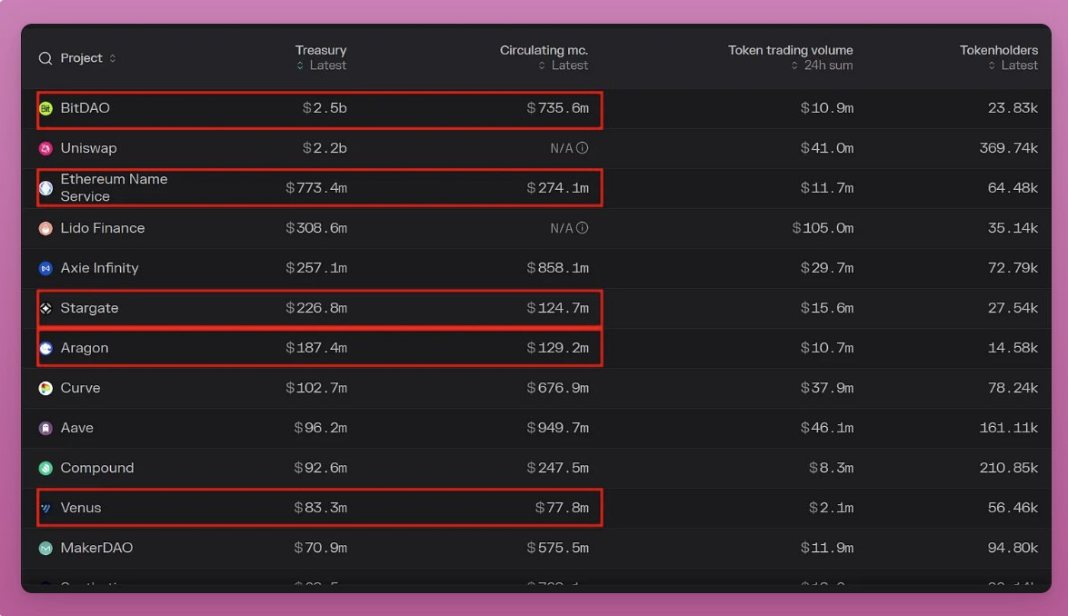 通过使用Token Terminal和DefiLlama,我们可以确定金库资产>代币市值的DAO。